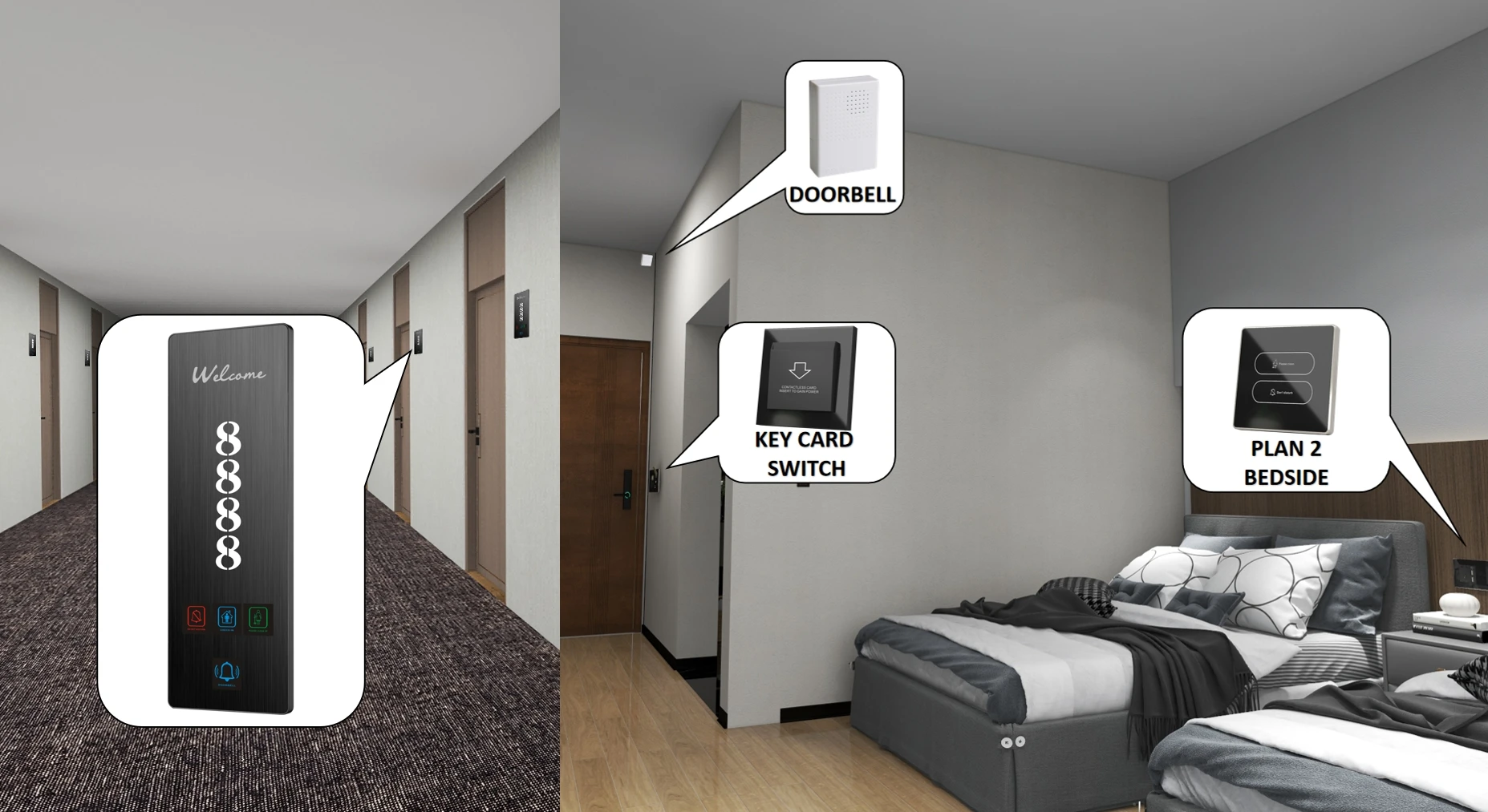 The hotel doorplate system is a system designed for the convenience of hotel management and to enhance the guest experience. It features intelligent connections between switches, doorbells, and doorplates, while customized doorplates elevate the hotel's prestige.